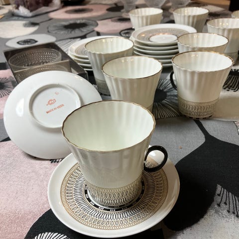 &Tradition posliinisarja, joka sisältää kahvikuppeja, lautasia, kermakon ja sokerikon. Sarjassa on kukkakuvioita ja kultareunukset. Sarja soveltuu kahvin ja teen tarjoiluun.