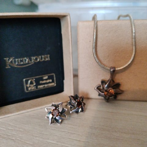 Kauniit hopeiset kukka korvakorut ja kaulakoru. Vähälle käytölle jääneet.