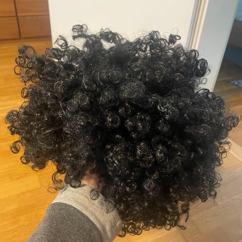 Myydään alkuperäisessä paketissa tumma Afro-peruukki. Peruukin koko on XXL, mutta joustavan hiusverkon ansiosta soveltuu aika monenkokoiselle.