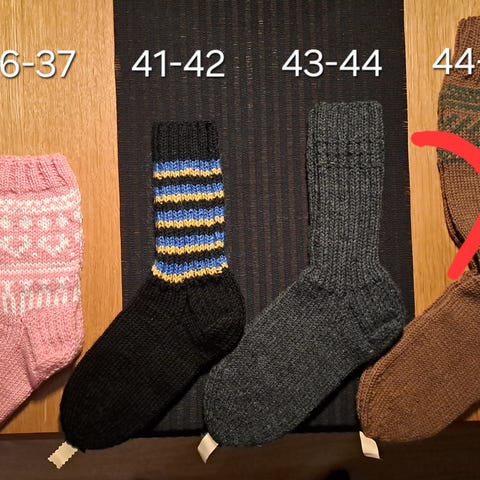 - Aikuisten sukat: koot 36-39 (jalkapohjan pituus on 23-24 cm), sopivat leveään jalkaan.