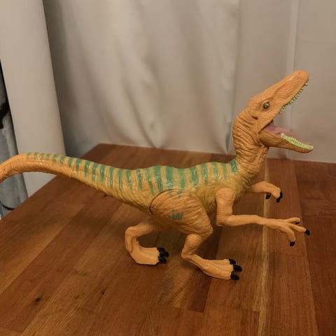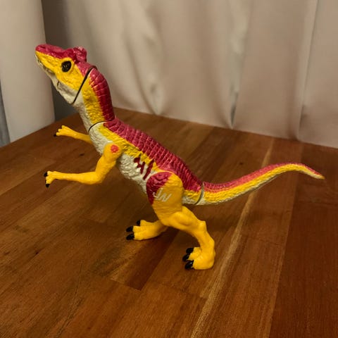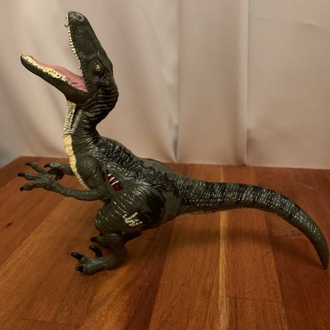 Tuote on Hasbron valmistama ja julkaistu vuonna 2015 osana Jurassic World -elokuvan oheistuotteita. Häntää sivulle painamalla suu aukeaa.