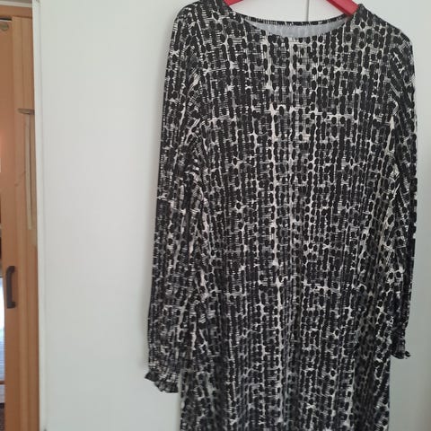 Ois merkkinen käytyämätön vaate. Materiaali polyester 87%,elastaani 13%.velourtuntuma, sisäpuoli liukas. Olkasauma- helma 95 cm.