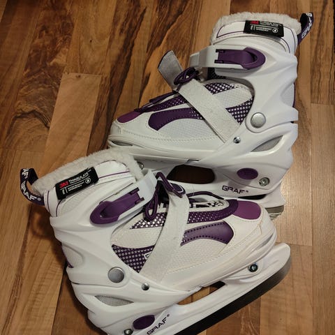 Luistimet eivät ole enää uudet, mutta kuitenkin aivan käyttökelpoiset. Viime talvena näillä viimeksi luistelu ja sillon ainakin luisti hyvin.