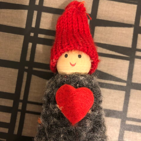 Myydään pehmeä tonttukoriste, jossa pohjalla hiekkaa yms., pysyy itsekseen pystyssä. Toisen sivun saumassa pieni suht huomaamaton reikä, joka helposti paikattavissa.