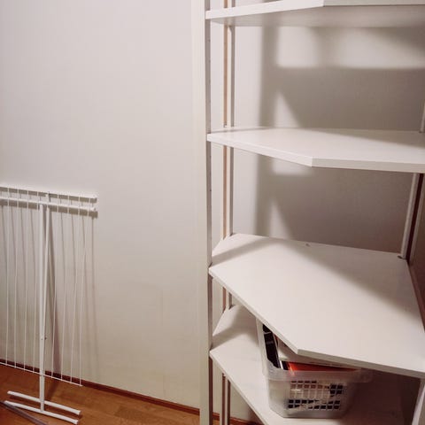 Lundia 228cm korkea kulmahylly jossa katteet ja viisi tasoa.