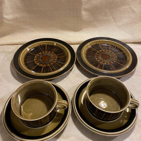 Arabia kahvikupit ja lautaset Kosmos-sarjaa, 2 kahvikuppia ja 3 lautasta. Kunto erittäin hyvä, paitsi yhdessä lautasessa pieni virhe, sitä viimeinen kuva. Yhteishintaan 18 euroa.