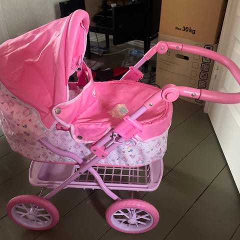 Baby Born lastenvaunut, joissa on kukkakuvioitu kangas ja punaiset pyörät. Lastenvaunut on suunniteltu lasten leikkeihin.