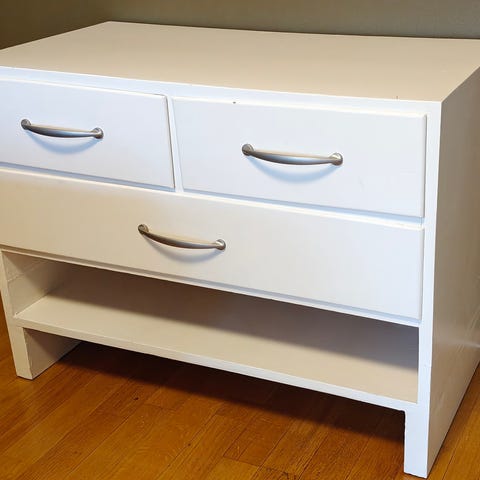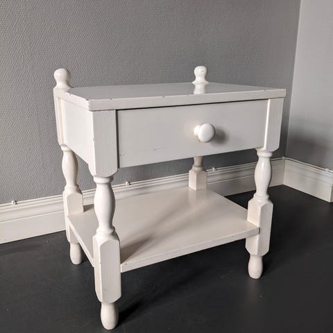 Hyvänkuntoinen yöpöytä, dc-fixiä päällä.