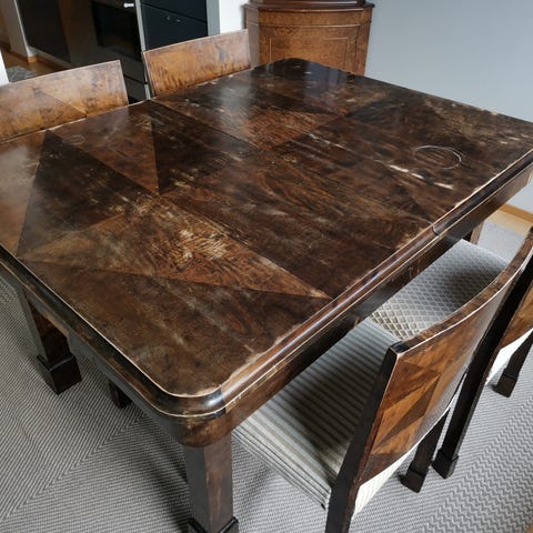 Raution ajan ruokapöytä, 8 tuolia ja kattokruunu