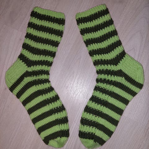 Raidalliset villasukat, koko 45. Käsintehdyt, konepestävät.