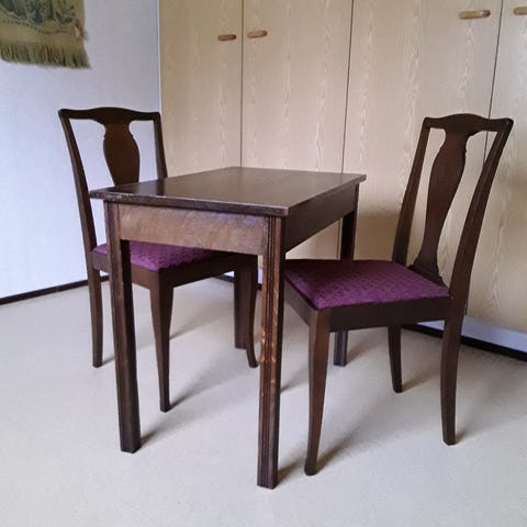 Puusepän tekemä 6 hengen pöytäryhmä saarnia. Pöytälevyn koko 98x198. Pöydän pinnassa jälkiä, vaatinee hionnan. Suonenjoella.