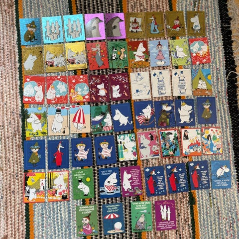 Erittäin hyväkuntoinen setti Muumikortteja. Kortteja yhteensä n. 440kpl. Kuvassa siis vain pieni otanta korteista. Alunperin sarjassa on 150kpl erilaista korttia. Tässä siis montaa korttia useampi kappale. Erilaisia kortteja on kuitenkin useampi kymmentä.