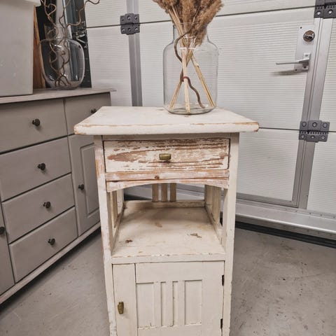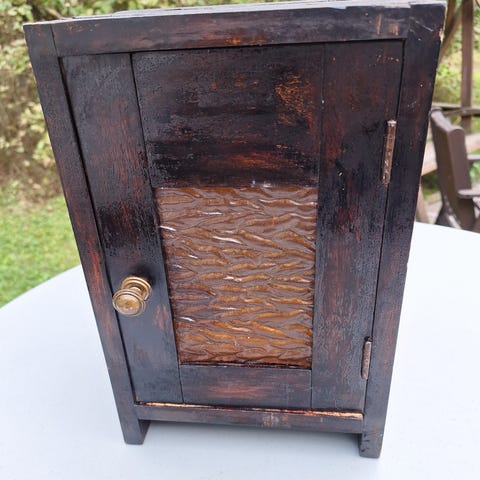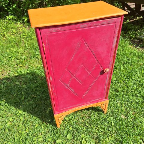 Hieno erikoinen massiivipuinen kaappi vaikka hopeiden säilytykseen. Avain on ja lukko toimii. Messinkikoristein. Leveys/syvyys 50/35cm, korkeus 72cm.