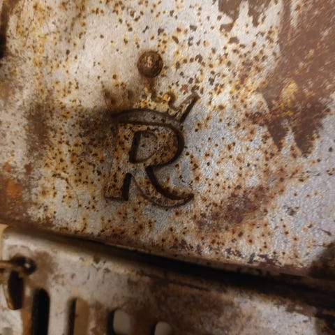 Pienen tuvan tulisijan luukku > R:llä ja kruunulla varustettu
