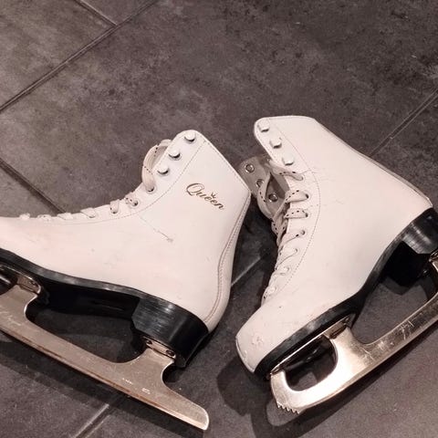 Queen lasten kaunoluistimet koko 34. Luistimista on etukärjen alimmat terät hiottu pois, jotta ei luistin "tökkää" jäähän.
