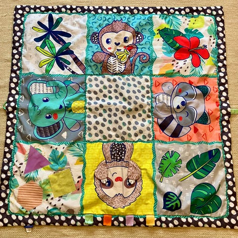 A functional play mat with colorful animal characters and numbers. The play mat includes musical elements, puzzle games, and various buttons that activate sounds.