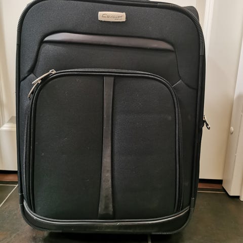 Violetti Cavalier matkalaukku. Vähän kulumaa alakulmissa. Vetopyörät. Edelleen toimiva laukku. Mitat: 60x39x20cm