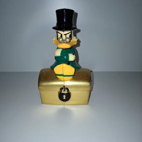 Roope Ankka säästöpossu / säästölipas. Roope punaisessa takissa. Keppi puuttuu. Kulumaa, erityisesti arkussa ja Roopen jalassa.