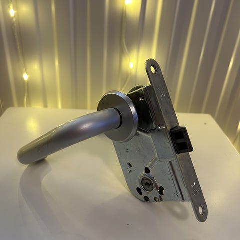 Metalliset ovenkahvat, yksi lukolla ja toinen ilman. Kahvat soveltuvat sisäoviin. Toinen sopii pidempien ruuvien ansiosta myös paksumpaan oveen. Sarja sisältää kahdet kahvat ja lukon mekanismin.