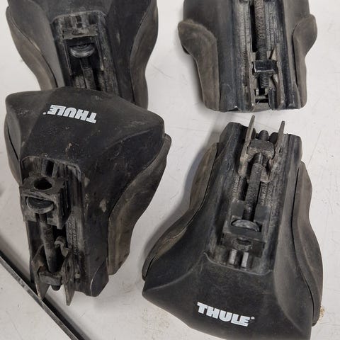 Thule kattotelineen asennussarja sisältää useita muovisia kiinnikkeitä ja asennusohjeet. Sarja on tarkoitettu kattotelineen kiinnittämiseen ajoneuvoon, ja se sisältää osat, jotka mahdollistavat telineen turvallisen ja tukevan asennuksen.