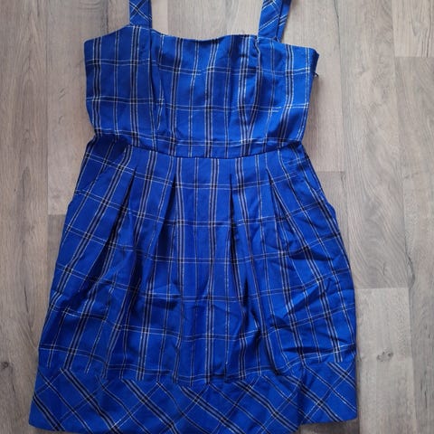 Lyhyen mallinen mekko kivoilla yksityiskohdilla. Olkaimia pystyy säätämään nappien avulla ja mekossa on solmimisnauha vyötäröllä. Mekon kainalo-kainalomitta on noin 40 cm ja mekon kokonaispituus on noin 88 cm.