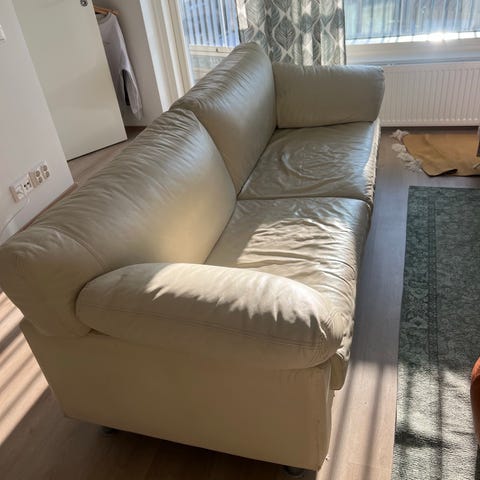 Valkoinen keinonahka sohva. Löytyy oikealla puolella tahra, näkyy kuvassa. Muuten on hyvässä kunnossa. Leveys 230 cm, syvyys 90 cm