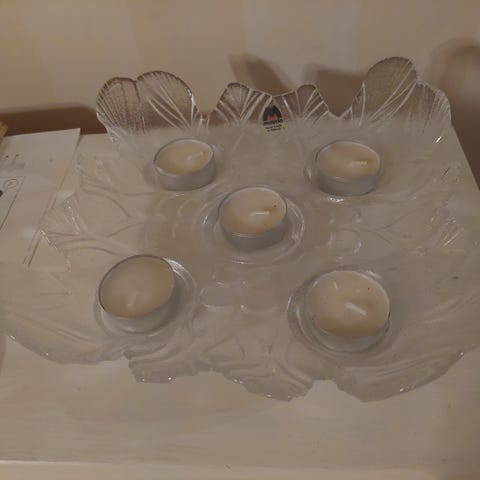 Kuvassa on Holmegaardin "Akande" eli "Water Lily" -sarjan kristallinen tuikkuastia.