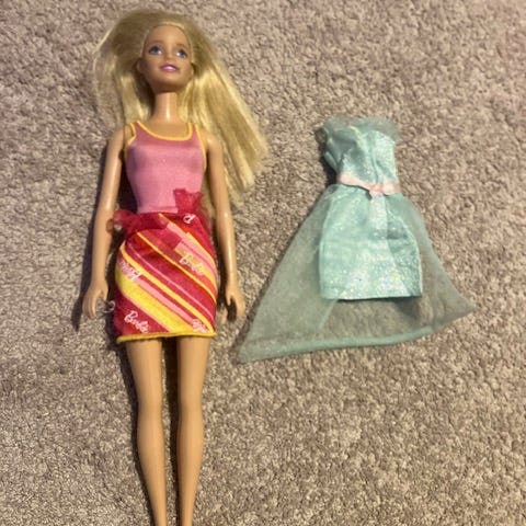 Barbie nukke, mukana asusteita kuten laukku ja kamera.