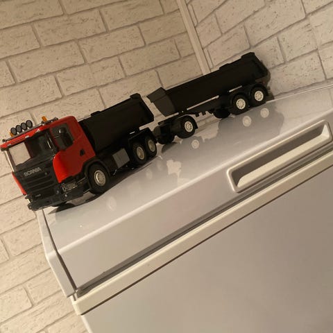 Emek Scania kuorma-auto lelu, jossa sininen ohjaamo, musta runko ja kippilava. Lelu on valmistettu kestävästä materiaalista ja soveltuu lasten leikkeihin.
