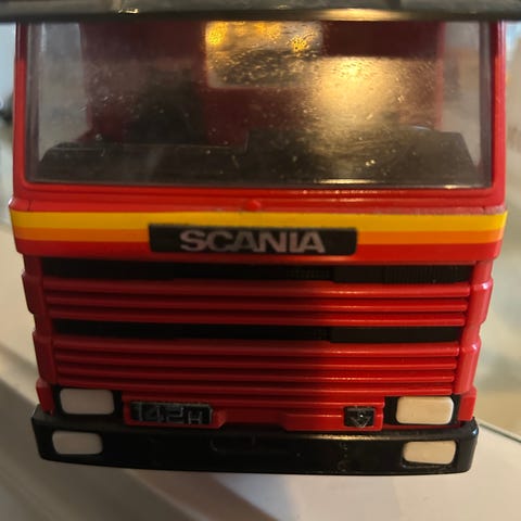 Scania R-sarja kuorma-auto ja sininen perävaunu. Kuorma-autossa on valkoinen väri ja perävaunu on sininen. Malli soveltuu kuljetustehtäviin ja on tarkoitettu leikkikäyttöön.