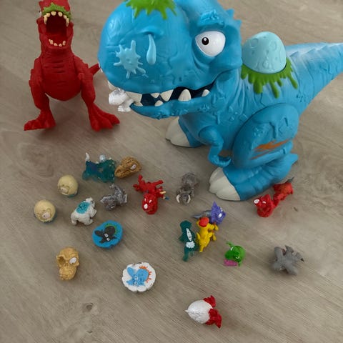 Zuru Smashers Series 3 Dino. HUOM: kuvassa näkyvät pikkuhahmot sekä peltirasia myyty! Dinon suuhun kun laittaa Smashers munan, nostaa sen häntää ja painaa sitten munankuorta alas, Dino kakkaa Smasher hahmon. Vain nouto Naantalin Suovuoresta tai Skanssin kauppakeskuksesta omien menojen mukaan. MMM.