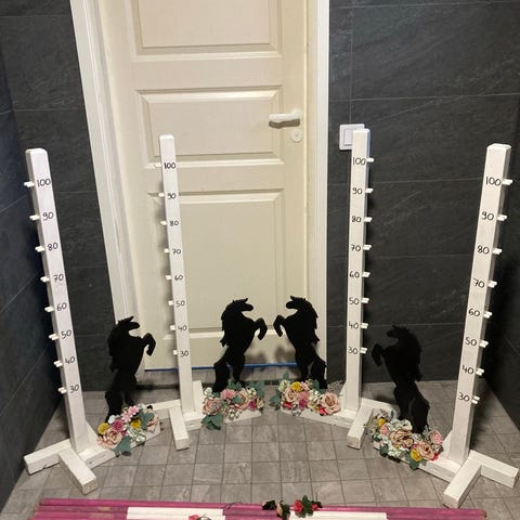 Keppihevosen este ja 3 keppihevosta yhteishintaan 50€. Esteen korkeus 100cm. 2 keppihevosta käsityönä tehtyjä ja 1 kaupasta ostettu. Vaaleanruskea ostettu käsityömarkkinoilta Porvoosta ja virheetön. Tummanruskea muuten ehjä mutta silmät hävinneet johonkin. Valkoinen yksisarvinen kaupasta ostettu, ehjä kyllä mutta muutama likatahra. Nouto Naantalin Suovuoresta tai Skanssin kauppakeskuksesta omien menojen mukaan. MMM.