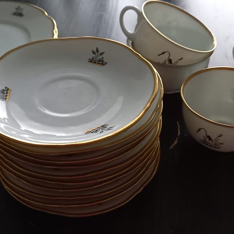 Kupit ja tassit ovat todella hyvässä kunnossa. Kultauksissa on ihan vähän kulumaa, tasseissa ehkä todella vähäistä käytön jälkeä (niin vähäistä, että valon pitää osua juuri oikein, että näkyy).