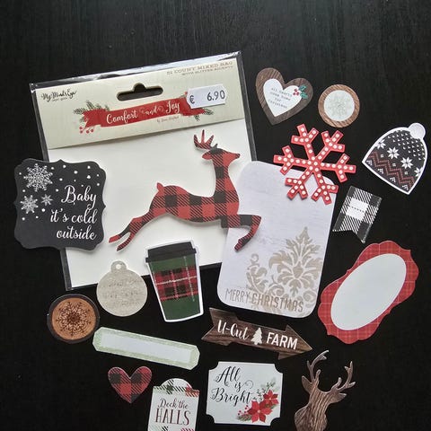 Die-Cut Tags jouluiset pakettikortit sisältävät erilaisia jouluteemaisia pakettikortteja eri muodoissa ja väreissä ( punainen, vihreä ja ruskea). Aiheina joulutähti kukka , joulukellot , joulukuusen oksa ja valkoinen kukka , mistelinoksat ja käpyjä.
