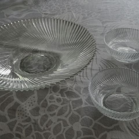 Metallinen tarjoiluastia lasilautasilla