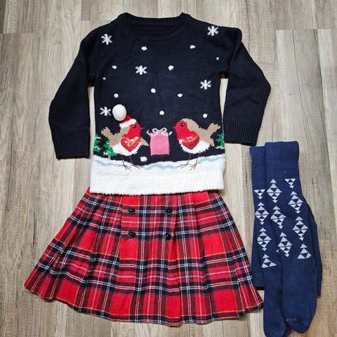 Tyttäremme rakasti tätä neulepuseroa ja käytti sitä silloin tällöin ennen joulua jopa kuusivuotiaaksi asti. Mutta se on siisti, ehjä ja aivan yhtä pehmeä. Punainen farkkuhame ja söpöt frotee-sukkahousut täydentävät asun.