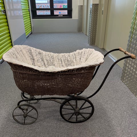 Vintage lasten leikkivaunut, joissa vaaleansininen ja punainen väritys. Vaunuissa on metallirunko, metalliset pyörät ja työntöaisa. Kori on muotoiltu koristeellisesti ja siinä on kiinteä kuomuosa. Sisällä on pehmusteita ja peitto. Sopii esimerkiksi lasten leikkeihin tai sisustuselementiksi.