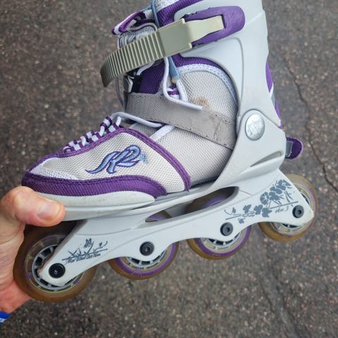 Koot 35-40 kattavat vähän käytetyt rullaluistimet, mukaan kuvan lilat suojavarusteet ( polvi- ja kyynärsuojat).