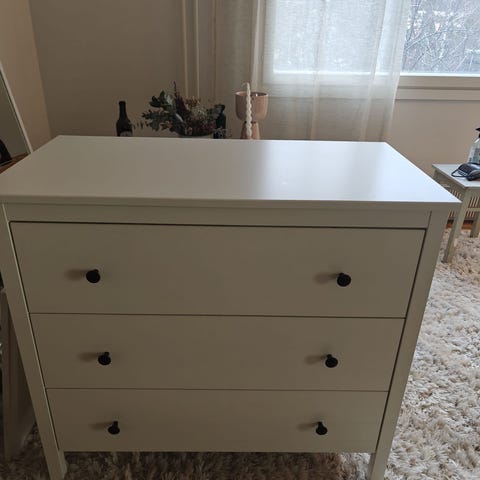 Myydään hyväkuntoinen valkoinen lipasto kolmella laatikolla. Väri: valkoinen/luonnon tammenvärinen.
