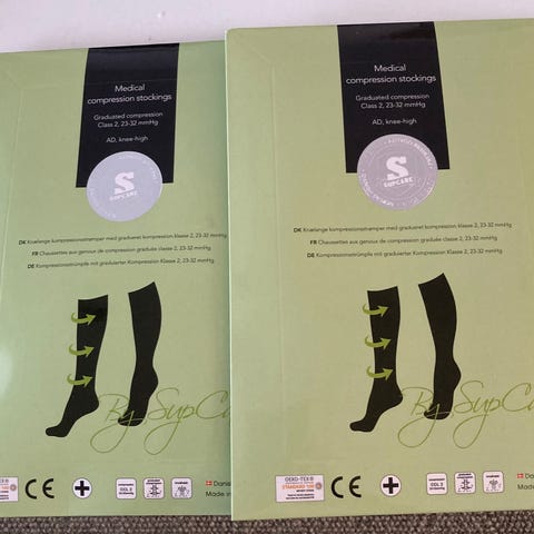 luomupuuvillasta valmistetut porrastetut kompressiosukat, joiden kompressio on 15–18 mmHg ja jotka ulottuvat polvipituisiksi.
