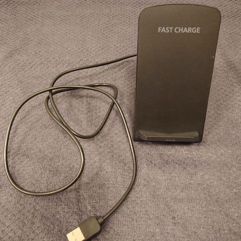 Langaton puhelimen latausteline. Mukana USB johto. Ei sisällä pistorasiaan tulevaa muunninta.