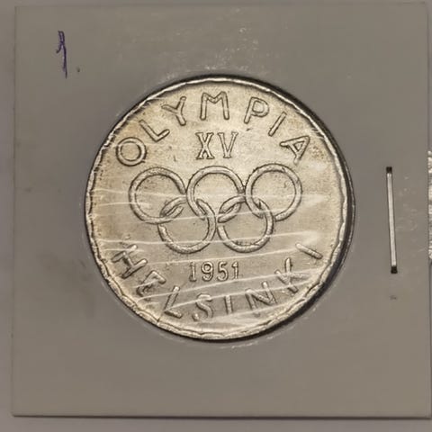 Myydään kuvan mukainen 500mk kolikko, joita tehty rajallinen määrä vuoden 1952 Helsingin Olympialaisten kunniaksi.