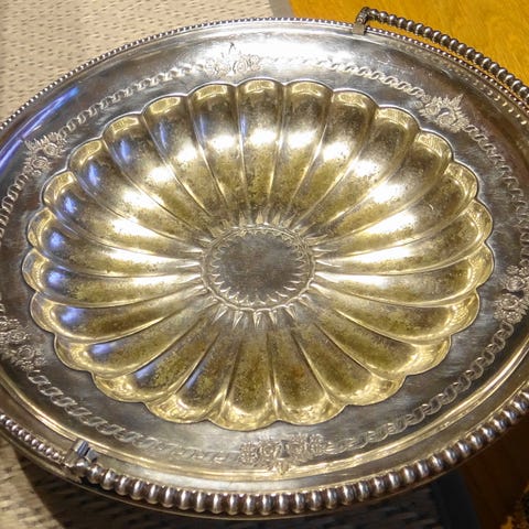 Rokokootyylinen Reilu kokoinen hedelmävati. Hopeavärinen ja runsaasti koristettu. Metallia. Mitat 30,5x27x9cm.
