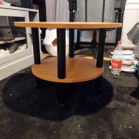 Siisti, moitteetomassa kunnossa oleva kaunis sohvapöytä, sivupöytä. Halkaisija 42cm, korkeus 49cm. Tarpeettomaksi jäänyt.