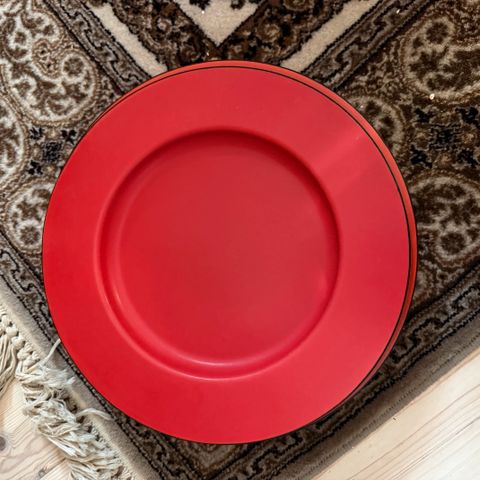 Joulunpunainen Finelin Emma emalilautanen. Halkaisija n. 27 cm. Iänmukaista kulumaa. Pohjassa pienet jäljet (ilmeisesti roikkunut joskus seinällä).