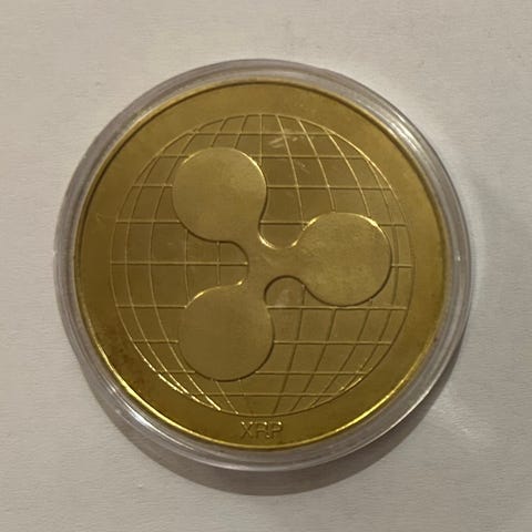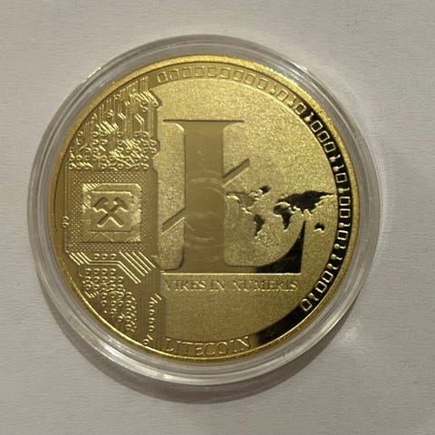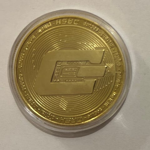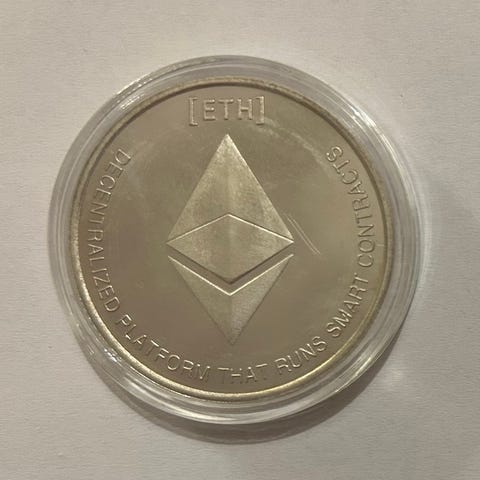 Ethereum keräilykolikko, väriltään kultainen. Kolikko on suojattu läpinäkyvällä muovikoteloilla molemmin puolin. tarkoitettu keräilyyn.