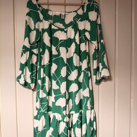 Laadukas Marks & Spencerin vuorillinen silkkimekko, selässä 48 cm pitkä vetoketju, kai-kai mitta 47 cm, olka-helma pituus 90 cm.