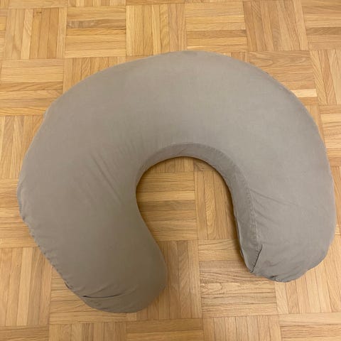 Harmaa IKEA-imetystyyny. Tyyny on ihanan tukeva ja auttaa imetyksessä tukemalla kättä. Tyynyssä muutamia tahroja (maitoa) jotka haalistuivat pesussa. Näkyvät haaleasti kuvissa.