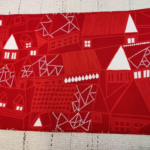 Marimekon iso joululiina pöydälle, Kristiina Isola, Kuusi, 1995. Punainen, koko 139 x 195cm.