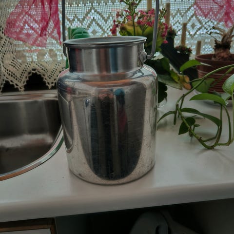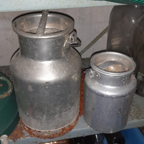 Pienet metalliset maitotonkat. N. 25 cm korkeat. Siistit. Ei ruostetta. Ei vuoda.